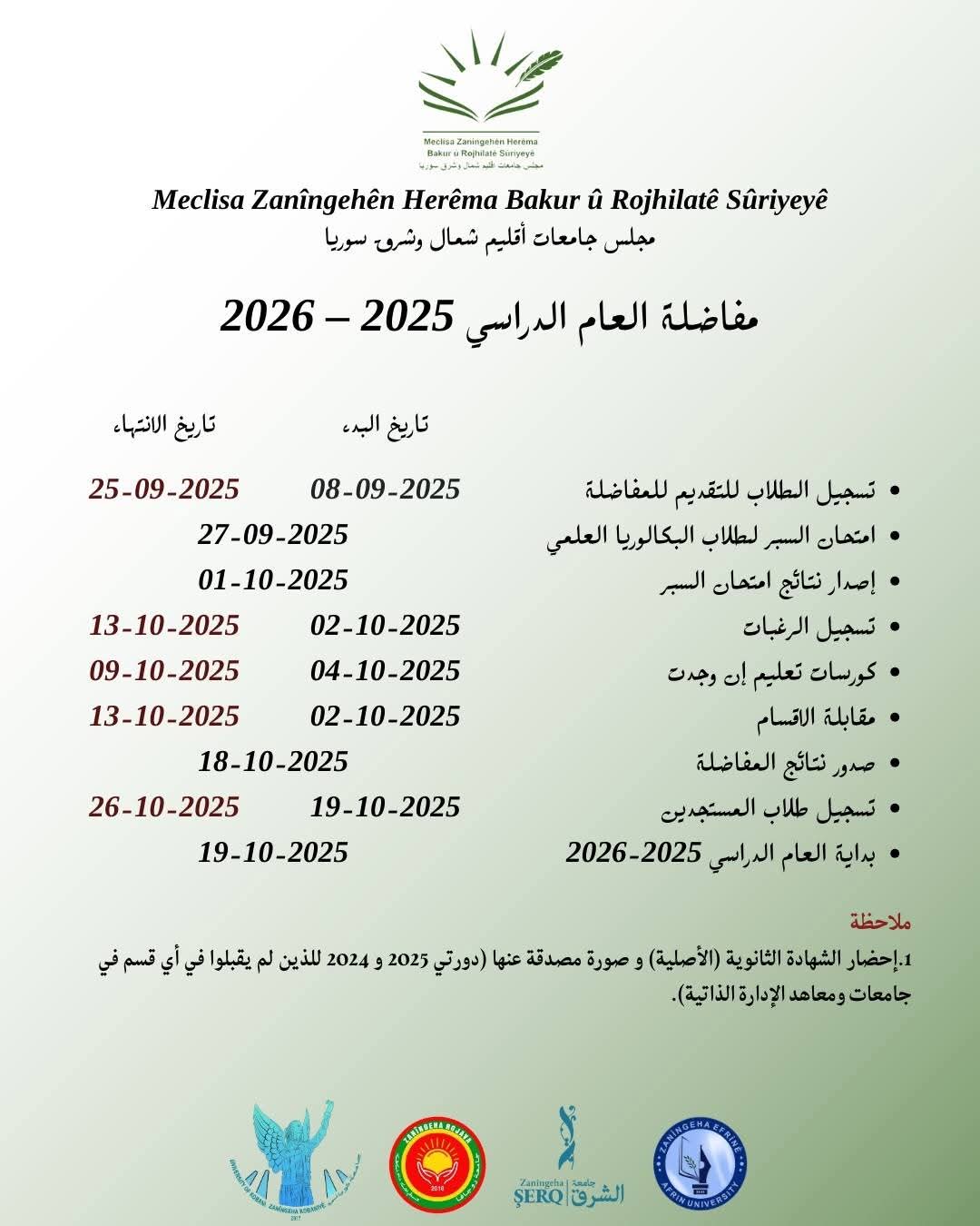 حرصاً من مجلس جامعات شمال وشرق سوريا على ألا يتخلف أي من أبنائنا الطلبة – ممن قدموا امتحاناتهم بمنهاج حكومة دمشق ولم يحصلوا على وثائقهم بعد- عن مفاضلة جامعات شمال وشرق سوريا، يُعلن عن تمديد استثنائي لفترة التسجيل في المفاضلة الجامعية، لتبقى أبواب جامعاتنا مشرعةً لاستقبال طلبتنا الأعزاء، وليتسنى لهم الحصول على مقاعد دراسية فيها.