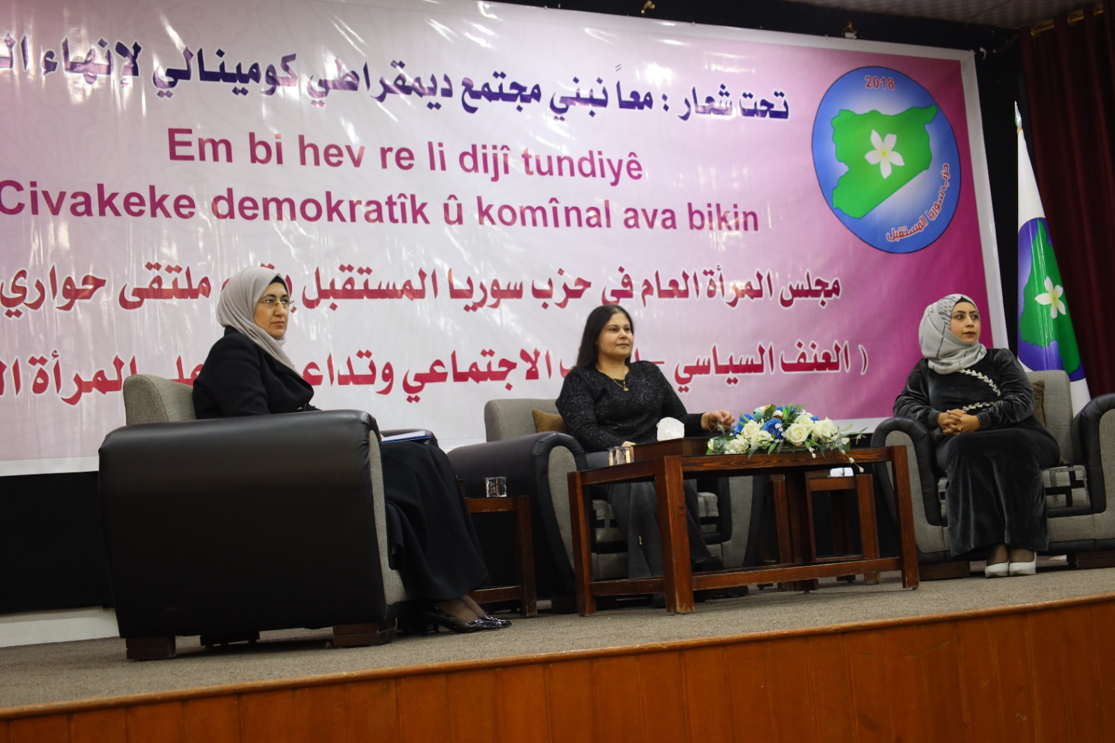 شارك وفد من الإدارة الذاتية الديمقراطية لإقليم شمال وشرق سوريا، اليوم، بملتقى حواري نظمه مجلس المرأة العام في حزب سوريا المستقبل، حول العنف السياسي والاجتماعي وتداعياته على المرأة السورية، وذلك في المركز الثقافي بمدينة الرقة.
