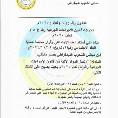 الرئيسية الرقة 20 سبتمبر حسين عثمان يؤكد استمرار الإدارة الذاتية بتطوير مهارات كوادر المؤسسات اقرأ المزيد 17 سبتمبر بهدف تطوير عمله…مجلس الشعوب الديمقراطي يُصدر عدة مخرجات تنظيمية اقرأ المزيد 16 سبتمبر مجلس الشعوب الديمقراطي يبحث سبل تعزيز العمل المشترك وتشكيل مجالس الأبعاد اقرأ المزيد 14 سبتمبر لجنة الأكاديميات في مجلس الاقتصاد والزراعة تخرج الدورة التدريبية الخامسة اقرأ المزيد 10 سبتمبر المجلس التنفيذي يؤكد على الرفع من وتيرة العمل في المشاريع الخدمية اقرأ المزيد 07 سبتمبر تعديلات قانون مكافحة الإرهاب رقم 7 اقرأ المزيد 07 سبتمبر قانون الإعلام في الإدارة الذاتية الديمقراطية لإقليم شمال وشرق سوريا اقرأ المزيد 07 سبتمبر تعديلات قانون الإجراءات الجزائية رقم 8 اقرأ المزيد 06 سبتمبر الإدارة الذاتية الديمقراطية لإقليم شمال وشرق سوريا تحتفل بالذكرى السنوية السابعة لتأسيسها اقرأ المزيد 06 سبتمبر خلال الاحتفال بذكراها السنوية.. “الإدارة الذاتية تمثل أملًا ونموذجا حقيقيًا لبناء مستقبل ديمقراطي لكل السوريين” اقرأ المزيد 1234