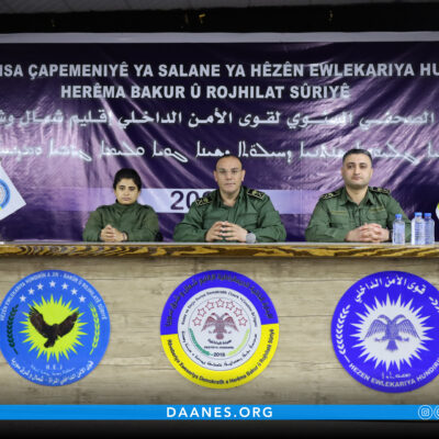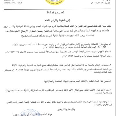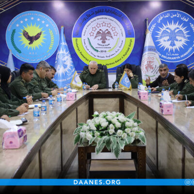 الرئيسية الدوائر والمكاتب 31 ديسمبر قوى الأمن الداخلي لإقليم شمال وشرق سوريا تكشف عن حصيلة أعمالها خلال عام 2025 اقرأ المزيد 28 ديسمبر هيئة الداخلية تعقد اجتماعها السنوي لعام 2025 وتضع خطة شاملة لتعزيز الأمن والاستقرار اقرأ المزيد 24 ديسمبر تعميم رقم /8/ اقرأ المزيد 16 ديسمبر تخريج دورة جديدة لصفّ الضباط لقوى الأمن الداخلي على مستوى شمال وشرق سوريا اقرأ المزيد 30 أكتوبر قوى الأمن الداخلي تصدر بياناً بمناسبة الذكرى الثانية عشرة لتأسيسها اقرأ المزيد 17 أكتوبر بيان صادر عن المديرية العامة للمرور في إقليم شمال وشرق سوريا اقرأ المزيد 10 أكتوبر افتتاح كلية العلوم الشرطية في إقليم شمال وشرق سوريا اقرأ المزيد 08 أكتوبر المديرية العامة للمرور تدعو في بيان إلى الالتزام بالقوانين المرورية لتفادي حوادث السير اقرأ المزيد 27 سبتمبر بيان صادر عن المديرية العامة للمرور حول ازدياد الحوادث المرورية اقرأ المزيد 25 سبتمبر اختتام فعاليات الكونفرانس الرابع لقوى الأمن الداخلي – المرأة اقرأ المزيد 12
