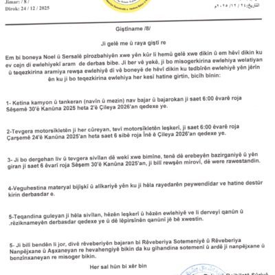 Sereke Dayîre û Nivîsgeh 31 Dec Hêzên Ewlekariya Hundirîn ên Bakur û Rojhilatê Sûriyê encamnameya xebatên xwe yên di sala 2025’an de kirine, eşkere kir Read More 28 Dec Desteya Hundirîn a Rêveberiya Xweseriya Demokratîk civîna xwe ya salane 2025`an lidar xist Read More 24 Dec Biryarnameya Hejmar /8/ Read More 16 Dec Hêzên Ewlekariya Hundirîn li ser asta Herêma Bakur û Rojhilatê Sûriyê dewreyek nû ya Efseran bidawî kir Read More 30 Oct Hêzên Ewlekariya Hundirîn bi boneya 12’emîn salvegera xwe de Daxuyaniyek da Read More 17 Oct Daxuyaniyek ji Rêveberiya Giştî ya Trafîkê li Bakur û Rojhilatê Sûriyê Read More 10 Oct Li Herêma Bakur û Rojhilatê Sûriyê Fakulteya Zanistên Polîsî hate vekirin Read More 08 Oct Gerendiya Giştî a Tirafîkê ya Herêma Bakur û Rojhilatê Sûriyê bi daxuyabiyekê bank li gelê herêmê kir ku bi zagonên tirafîkê bapendbin Read More 27 Sep Daxuyaniya Rêveberiya Giştî ya Trafîkê di derbarê zêdebûna qezayên trafîkê de Read More 25 Sep 4`emîn Konferansa Hêzên Ewlekariya Hundirîn – Jin bidawî bû Read More 12