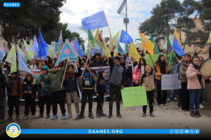 Rêveberiya Xweser ji bo şermezarkirina binpêkirinên li Şêx Meqsûd û Eşrefiyê beşdarî meşa girseyî li Reqayê bû
